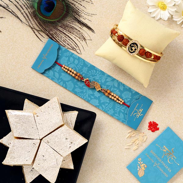 Product Details One Om Rudraksha Bracelet Style Rakhi, This devotional rakhi highlights Om & rudraksha detailing for a spiritual look, One Red Peacock Designer Rakhi, This designer rakhi highlights red peacock detailing, Kaju Katli- 250 gms,