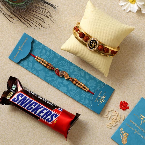 Product Details One Om Rudraksha Bracelet Style Rakhi, This devotional rakhi highlights Om & rudraksha detailing for a spiritual look, One Red Peacock Designer Rakhi, This designer rakhi highlights red peacock detailing, One Snickers Chocolate Bar,
