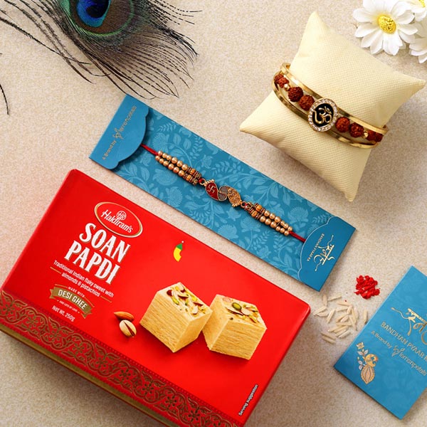 Product Details One Om Rudraksha Bracelet Style Rakhi, This devotional rakhi highlights Om & rudraksha detailing for a spiritual look, One Red Peacock Designer Rakhi, This designer rakhi highlights red peacock detailing, Soan Papdi- 250 gms,