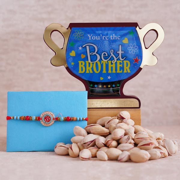 Rakhi • Rakhi Type: Golden OM Rakhi • Set Type: Single Rakhi • Recipient: Brothers • Color: Multicolored • Material Used: Gold-platted metal, beads, stones, and silk threads • A packet of Roli and Chawal with containers Dry fruits • 100 gm Pistachios Other Gifts • A designer trophy for brother with the text “You’re the best brother.”