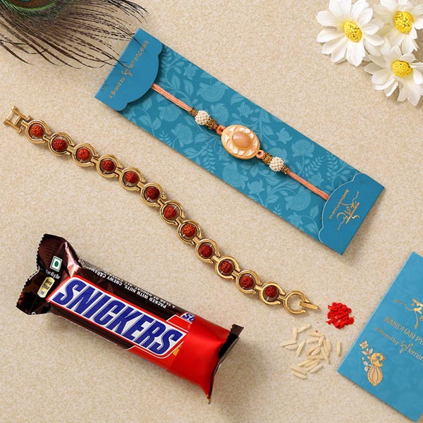 Product Details One Peach Stone Rakhi, This rakhi highlights a peach stone for an appealing look, One Rudraksha Bracelet Style Rakhi, This bracelet style rakhi highlights Rudraksha for an auspicious look, One Snickers Chocolate Bar,