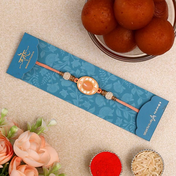Product Details One Peach Stone Rakhi, This rakhi highlights a peach stone for an appealing look, One Gulab Jamun Tin- 1 Kg, Complimentary Roli Chawal packed in a small card, This Rakhi is packed & delivered in a Beautiful Traditional Sneh Rakhi Box,
