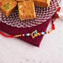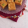 Rakhi • Rakhi Type: Peacock Feather Rakhi • Set Type: Single Rakhi • Recipient: Brothers • Color: Multicolored • Material Used: Gold-plated metal, beads, and silk threads • A packet of Roli and Chawal with containers Sweets • Haldiram Chana Sattu Burfi – 250 gm