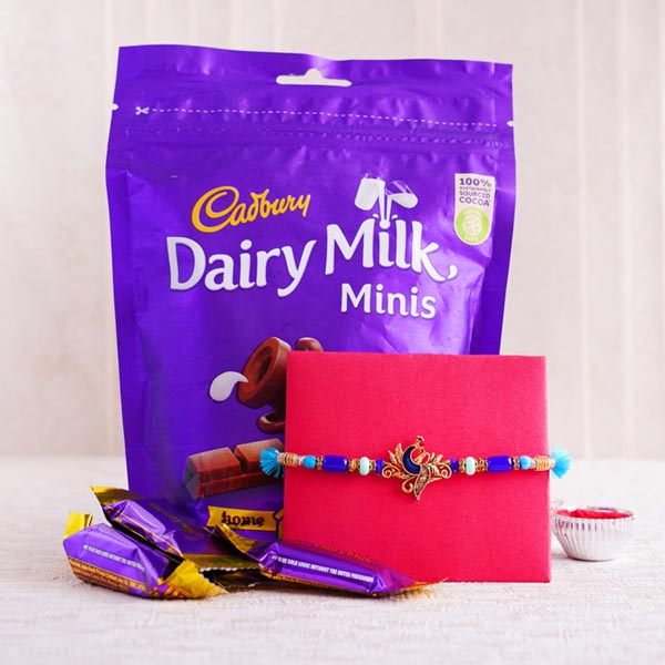 It contains: • Rakhi Type: Peacock Rakhi • Set Type: Single Rakhi • Color: Blue Rakhi • A packet of Roli and rice with containers Chocolate • 126 gm Cadbury Dairy Milk Minis