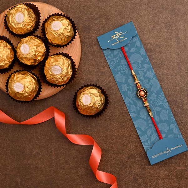 Product Details One Pearl In A Circle Mauli Rakhi, This rakhi displays pearl in a circle for a appeasing look, Ferrero Rocher, Quantity- 3 Pcs, Complimentary Roli Chawal packed in a small card, Beautifully packed in Sneh Box