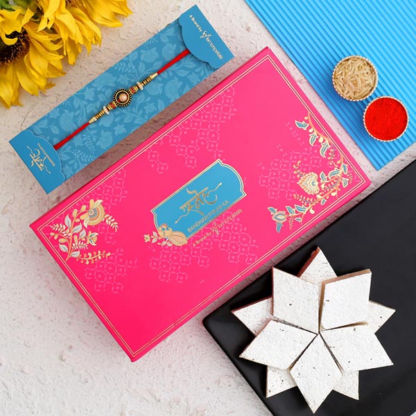Product Details One Pearl In A Circle Mauli Rakhi, This rakhi displays pearl in a circle for a appeasing look, Haldiram Kaju Katli, Weight- 250 gms, Complimentary Roli Chawal packed in a small card, Beautifully packed in Sneh Box