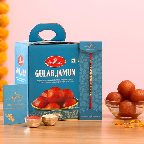 Product Details This rakhi displays golden pearl detailing for a festive look, Haldiram''s Gulab Jamun- 250 gms, Complimentary Roli Chawal packed in a small card, This Rakhi is packed in a beautiful Sneh envelope