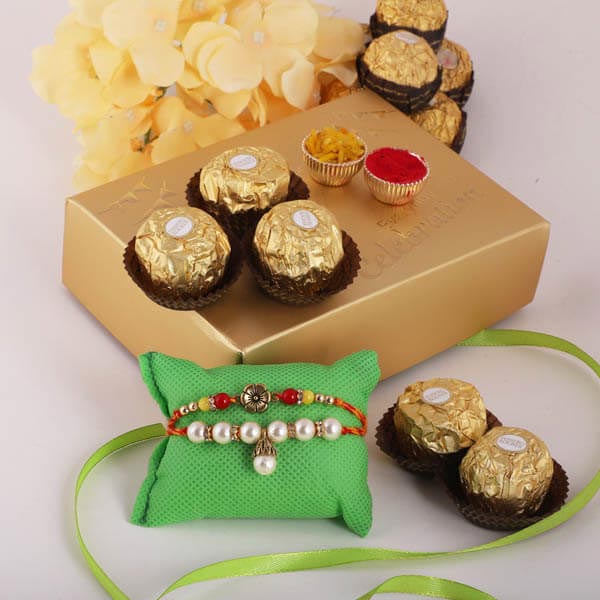 Traditional Golden Pearl Rakhi And 3 Pcs Ferrero Rocher