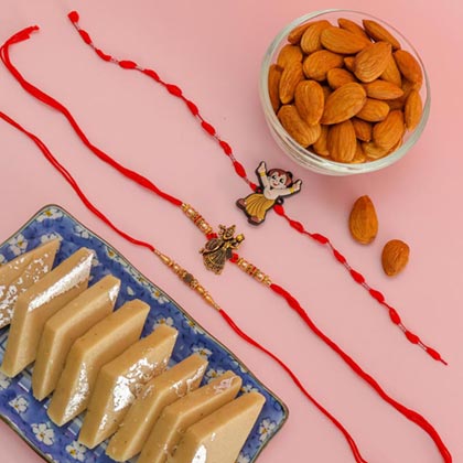 Pearl, Radha Krishna & Chota Bheem Set of 3 Rakhis With Kaju Katli & Almonds