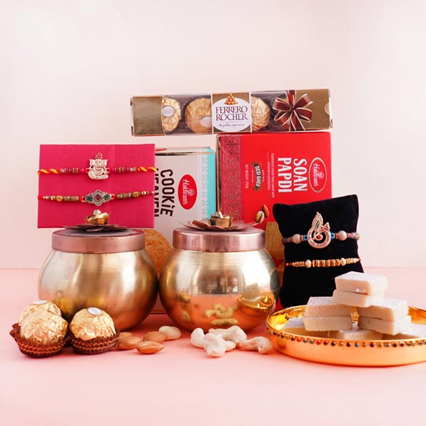 Product Details: • One Golden Ganesha Rakhi for brother • One Golden Mor Phank Rakhi for Brother • One designer Silver Rakhi for Brother • One Beaded Rakhi for Brother • One pack of Ferrero Rocher having 4 pieces • One pack of Haldiram Soan Papadi of 250gm • One pack of Haldiram Coconut Cookies of 180gm • 100gm of Almonds packed in a designer golden container • 100gm of Cashew packed in a designer golden container • 500gm of Haldiram Kaju Katli • One mini golden puja thali • Roli and chawal are also included