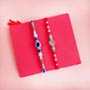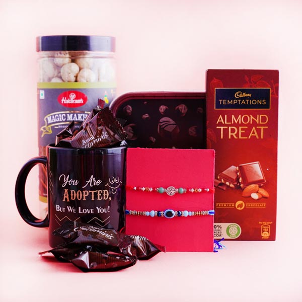 Product Details • Rakhi Type: One Evil Eye Rakhi and One Silver Rakhi • Set Type: Set of Two Rakhis • Recipient: Brothers • Color: Multicolored • Material Used: Silver-plated metal, evil eye stones, beads, and silk threads • Brand: • A packet of Roli and Chawal with containers Dry fruits • One packet of Haldiram Roasted Makhana of 70 gm Chocolates • One Almonds Temptation of 72 gm Sweets • One box of Amul Chocomini Chocolate of 250 gm Other Gifts • One brother mug