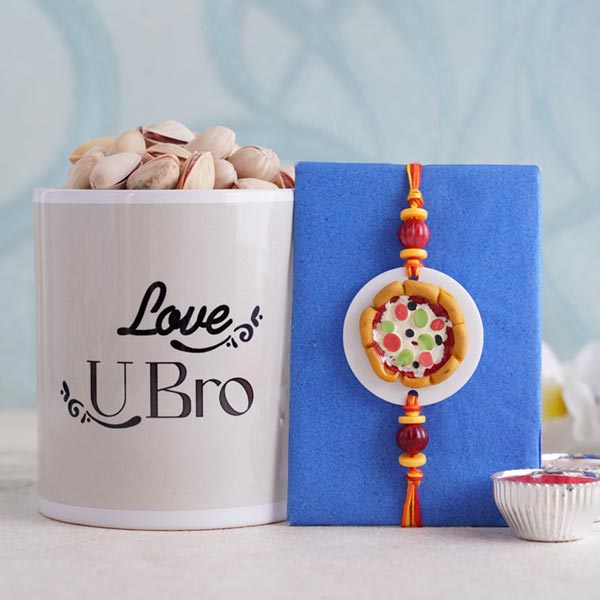 Rakhi Details: •Type of Rakhi: Pizza food Rakhi for kids •Rakhi Set: Single •Recipient: Brother •Color: Multicolored •Material Used: Plastic, fabric, beads, and silk thread •Roli and chawal pack along with containers are included with hamper Dry Fruits: •100gms of Pistachios Other Gift Items: •One white-colored mug with the text “Love U Bro”