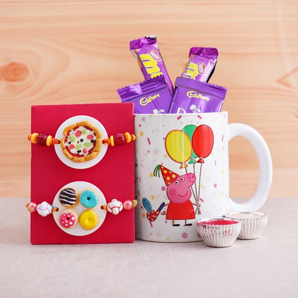 Product Details: • Pizza foodie Rakhi and Donut foodie Rakhi for Kids • Two Dairy Milk chocolates of 13gm each • Two Munch chocolates of 10gm each • One Peppa Pig mug • Roli and Chawal with containers are included