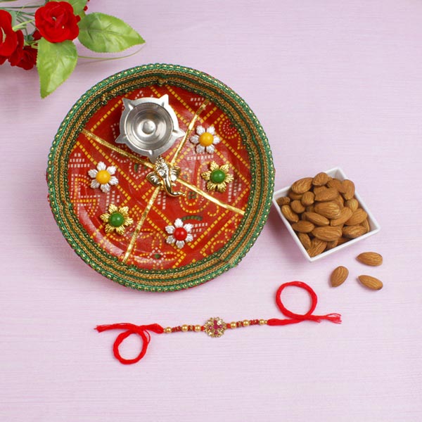 Pleasing Pink Diamond Puja Thali Almond Rakhi Hamper For UK