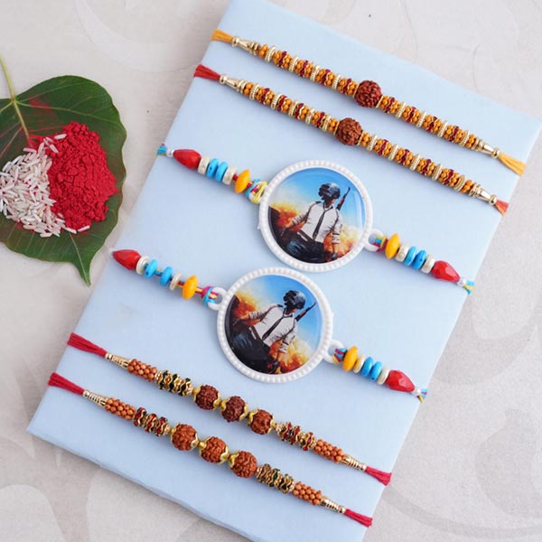Product Details: • Rakhi Type: A pair of PUBG Rakhi and Four Rudraksha Rakhis • Set Type: Set of Six • Recipient: Brother • Color: Multicolored • Material Used: Plastic motifs, Rudraksha, beads, and a silk thread • Brand: Rakhi.in • Roli & Chawal with containers are included with this Rakhi set