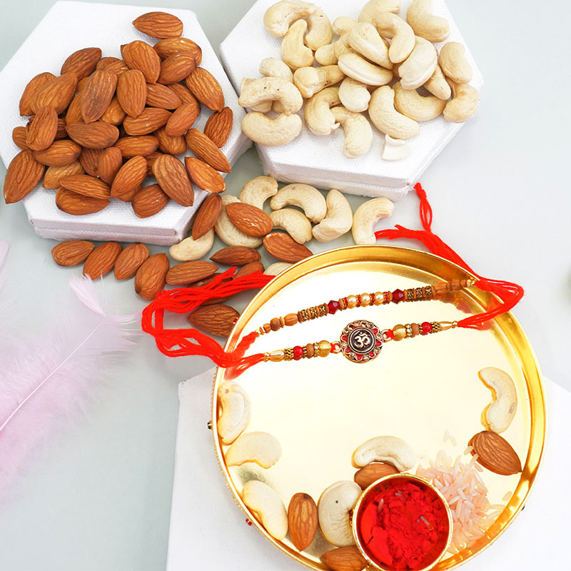 set of Om Rakhi N Pearl Rakhi with Dry Fruits