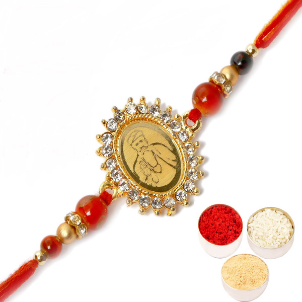 A beautiful divine rakhi traditionally designed with american diamonds and beads to make it unique in its own way.Free Roli, Chawal and chandan pouches go along with this product.