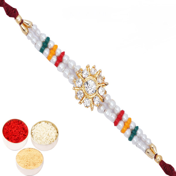 A beautiful pearl rakhi traditionally designed with beads, stones and american diamonds to make it unique in its own way.Free Roli, Chawal and chandan pouches go along with this product.