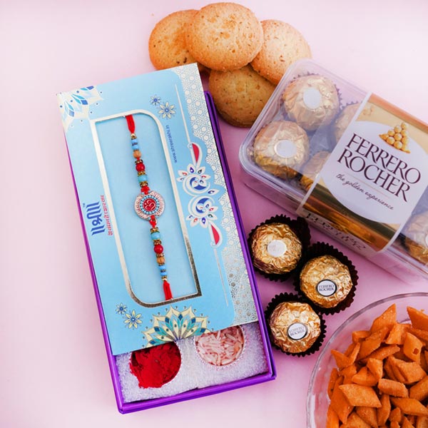 Product Details: • One Rakhi signature box with a designer Rakhi and roli chawal containers • 16 pieces of Ferrero Rocher chocolates • One pack of Haldiram Ajwain Cookies of 150gm • One pack of Haldiram Matthi of 225gm