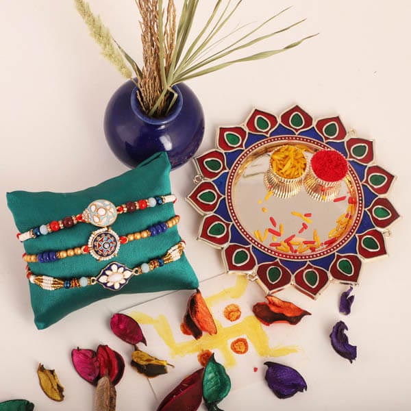 Traditional Golden Pearl Rakhi And 3 Pcs Ferrero Rocher