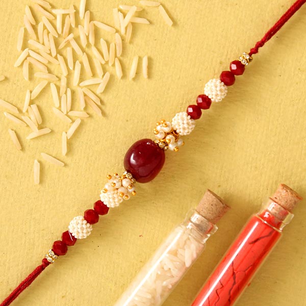 Product Details One Red Beads Pearl Designer Rakhi, This designer rakhi showcases red beads & pearls for an enticing look, Complimentary Roli Chawal packed in a small card, This Rakhi is packed in a beautiful Sneh envelope