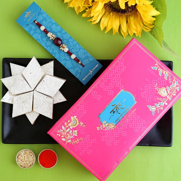 Product Details One Red Beads Pearl Designer Rakhi, This designer rakhi showcases red beads & pearls for an enticing look, Haldiram Kaju Katli, Weight- 250 gms, Complimentary Roli Chawal packed in a small card, Beautifully packed in Sneh Box