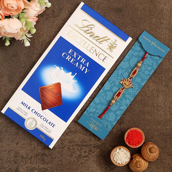 Product Details One Red Peacock Designer Rakhi, This designer rakhi highlights beautiful red peacock making it an irresistible pick, Lindt Excellence Extra Creamy Bar- 100 gms