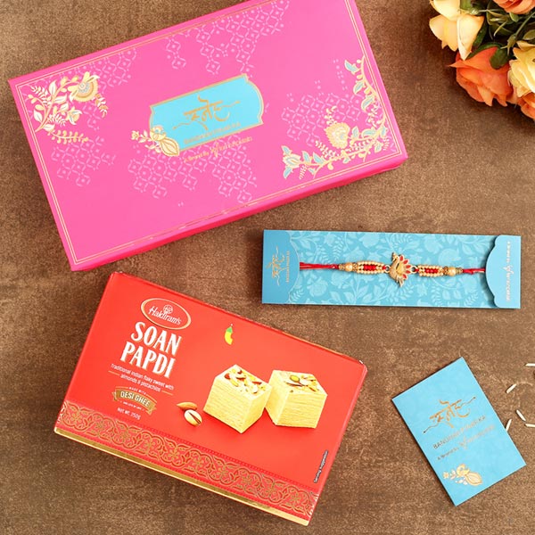 Product Details One Red Peacock Designer Rakhi, This designer rakhi highlights beautiful red peacock making it an irresistible pick, Haldiram''s Soan Papdi, Weight- 250 gms, Complimentary Roli Chawal packed in a small card, Beautifully packed in