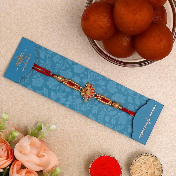 Product Details One Red Peacock Designer Rakhi, This designer rakhi highlights a red peacock, One Gulab Jamun Tin- 1 Kg, Complimentary Roli Chawal packed in a small card, This Rakhi is packed & delivered in a Beautiful Traditional Sneh Rakhi Box,