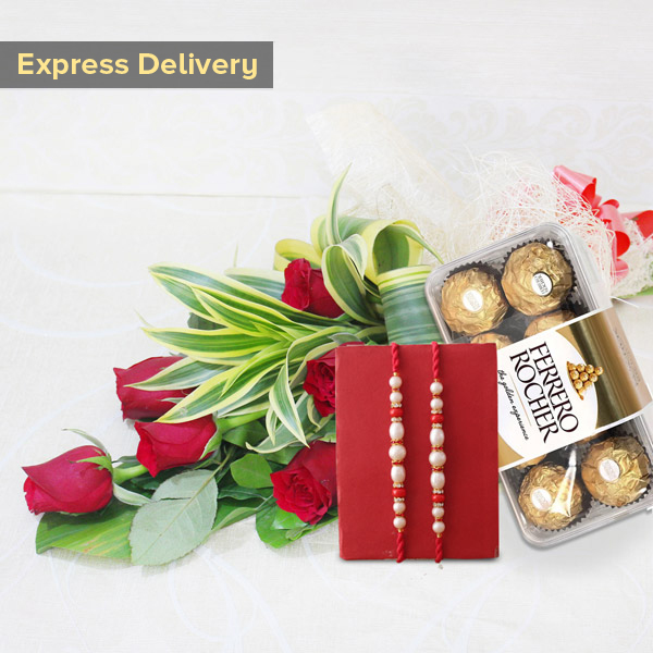 It Contains: • 1 Bouquet of 6 Red Roses • 16 Pieces of Ferrero Rocher weighing 200 gm • 2 Rakhis • Roli & Chawal Hurry…time is running!! We are here with our express services that will allow you to get your order delivered in a small span of time. And, this Rakhi gift that we have designed with fresh Roses, Chocolates and Rakhis will never be a bad choice. Mark the word…..it’s definitely going to help!! Place your order now!!