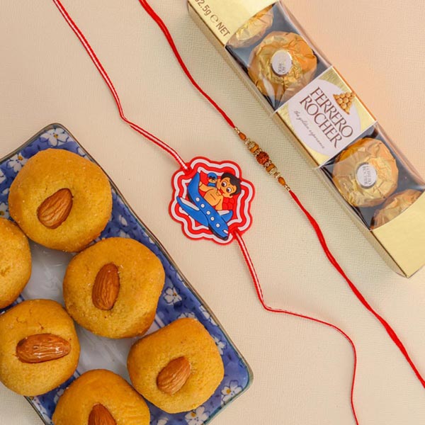 Rudraksh & Kids Set of 2 Rakhis With Besan Laddoo & Ferrero Rocher
