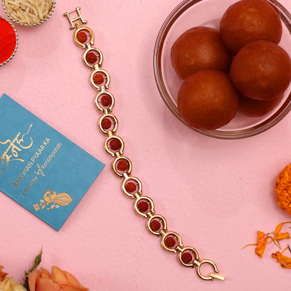 Product Details One Rudraksha Bracelet Style Rakhi, This devotional rakhi highlights rudraksha detailing for a divine look, Haldiram''s Gulab Jamun- 250 gms, Complimentary Roli Chawal packed in a small card, This Rakhi is packed in a beautiful Sneh envelope,