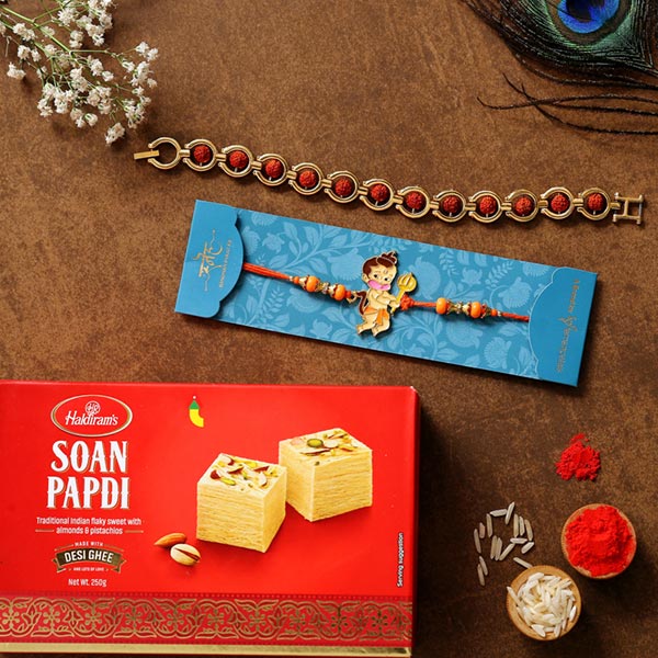 Product Details One Bal Hanuman Kids Rakhi, This rakhi is categorically designed for kids who are fond of devotional cartoon characters, One Rudraksha Bracelet Style Rakhi, This bracelet style rakhi highlights Rudraksha for an auspicious look, Soan Papdi- 250 gms,