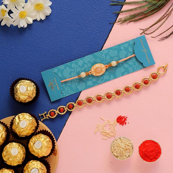 Product Details One Peach Stone Rakhi, This rakhi highlights a peach stone for an appealing look, One Rudraksha Bracelet Style Rakhi, This bracelet style rakhi highlights Rudraksha for an auspicious look, Ferrero Rocher- 6 Pcs,