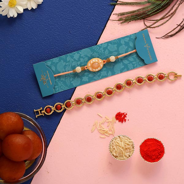Product Details One Peach Stone Rakhi, This rakhi highlights a peach stone for an appealing look, One Rudraksha Bracelet Style Rakhi, This bracelet style rakhi highlights Rudraksha for an auspicious look, One Gulab Jamun Tin- 1 Kg,