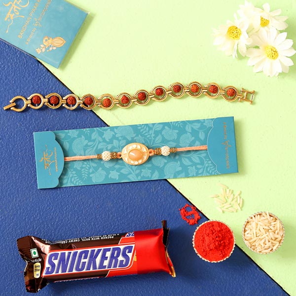 Product Details One Rudraksha Bracelet Style Rakhi, This bracelet style rakhi highlights Rudraksha for an auspicious look, One Peach Stone Rakhi, This rakhi highlights a peach stone for an appealing look, One Snickers Chocolate Bar,