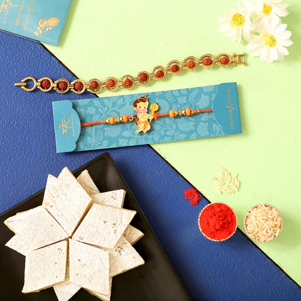 Product Details One Rudraksha Bracelet Style Rakhi, This bracelet style rakhi highlights Rudraksha for an auspicious look, One Bal Hanuman Kids Rakhi, This rakhi is categorically designed for kids who are fond of devotional cartoon characters, K