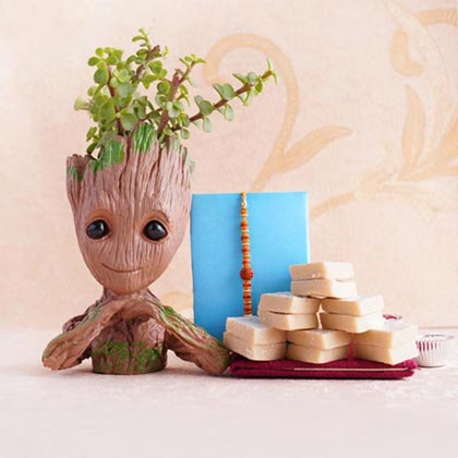 Rudraksha Rakhi with Haldiram Kaju Burfi N Jade Plant