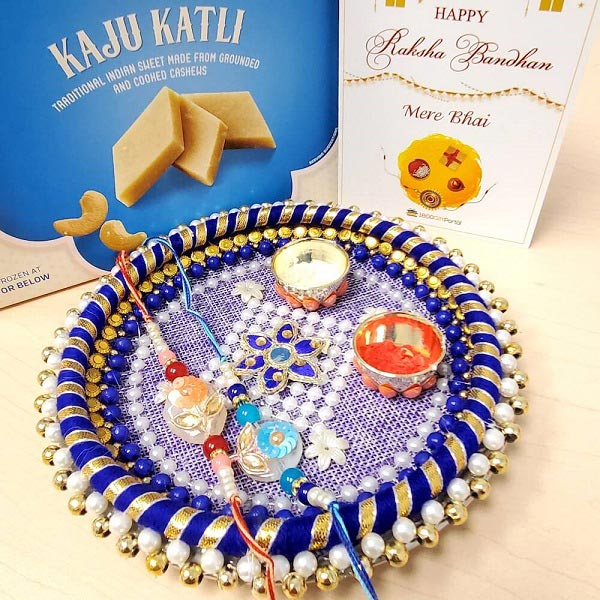 Sequins Rakhi Pair, Thali & Kaju Katli