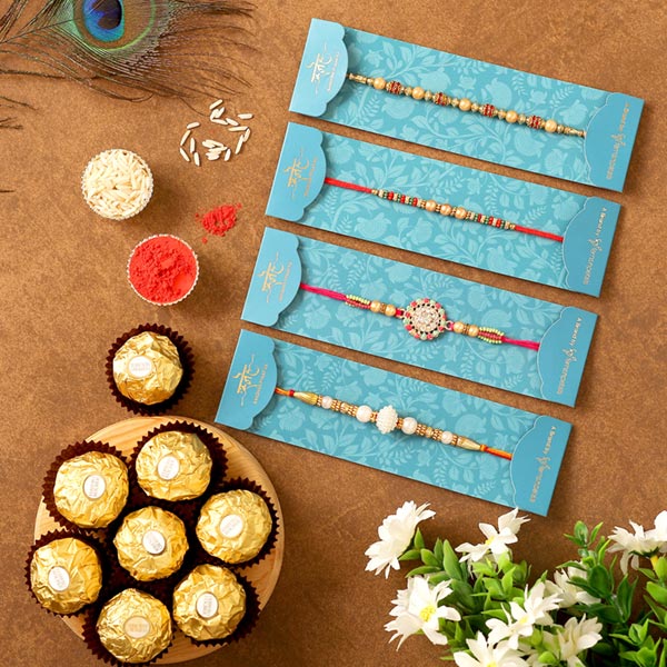Product Details One White Pearl Rakhi, This rakhi showcases white pearl detailing for a serene look, One American Diamond Flower Rakhi, , One Pearl Beads Rakhi, This Rakhi is intricately designed with pearls and beads, Ferrero Rocher- 6 Pcs,