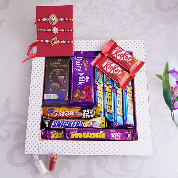 Rakhi •Rakhi Type: Designer Rakhi •Set Type: Set of 3 •Recipient: Brothers •Color: Multicolored •Material Used: Gold-platted metal, beads, stones, and silk threads Chocolates •1 Dairy Milk Fruits and Nuts of 36 gm •1 Bourneville of 31 gm •2 Munch of 11gm each •4 Perk of 14 gm each •1 5 Star of 25gm •1 Snickers of 22gm •2 KitKat of 12.8gm each Other Items: •A packet of Roli and Chawal with containers are also included •A designer tray is also included with this Rakhi with chocolates hamper