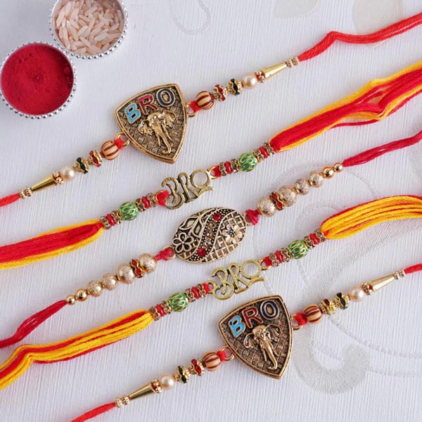 Send Rakhi »  Set of 5 Rakhi » Set of 5 Divine Golden Rakhi