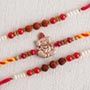 Product Overview: • Rakhi Type: Two Rudraksha Rakhis and One Ganesha Rakhi • Set Type: Set of 3 Rakhi • Recipient: Brothers • Color: Multicolored • Material Used: Rudraksha, Gold-plated metal and silk thread • A pack Roli & Chawal and containers are included with Rakhi set