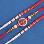 Product Overview: • Rakhi Type: Two Beaded Rakhis and One Stone Rakhi • Set Type: Set of 3 Rakhi • Recipient: Brothers • Color: Multicolored • Material Used: Colorful beads, stones, Gold-plated metal, and silk thread • A pack Roli & Chawal and containers are included with Rakhi set