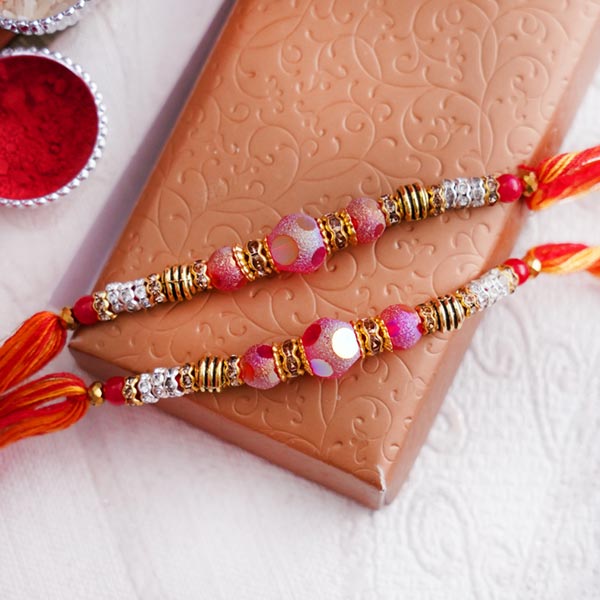 Product Details • Rakhi Type: Pearl Rakhi • Set Type: Set of Two Rakhis • Recipient: Brothers • Color: Multicolored • Material Used: Stones, pearls, beads, and silk threads • Brand: Rakhi • A packet of Roli and Chawal with containers are also included