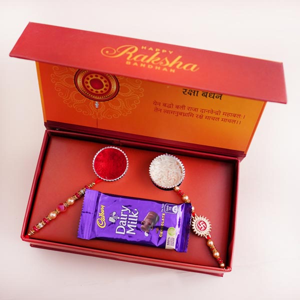 Product Details:The Signature Box Contains: • Two designer Rakhis for brother • 5 Daily Milk Chocolates each of 12 gm • Roli and Chawal in containers attached with the designer signature box
