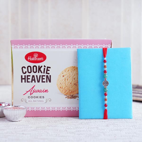 Rakhi Details: • Rakhi Type: Silver Rakhi • Set Type: Single Rakhi • Recipient: Brothers • Color: Multicolored • Material Used: Silver-platted metal, beads, stones, and silk threads • A packet of Roli and Chawal with containers Cookies • A pack of Haldiram Ajwain cookies of 150gm