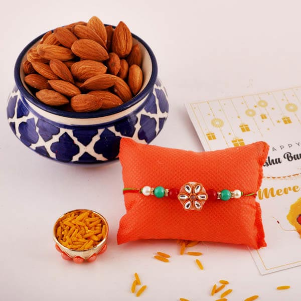 Traditional Golden Pearl Rakhi And 3 Pcs Ferrero Rocher