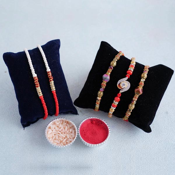 Product Overview: • Rakhi Type: Five beaded Rakhis • Set Type: Set of 5 Rakhis • Recipient: Brothers • Color: Multicolored • Material Used: Stones, beads, gold-plated metal, and silk thread • Pack of Roli & Chawal and containers are free with Rakhi set