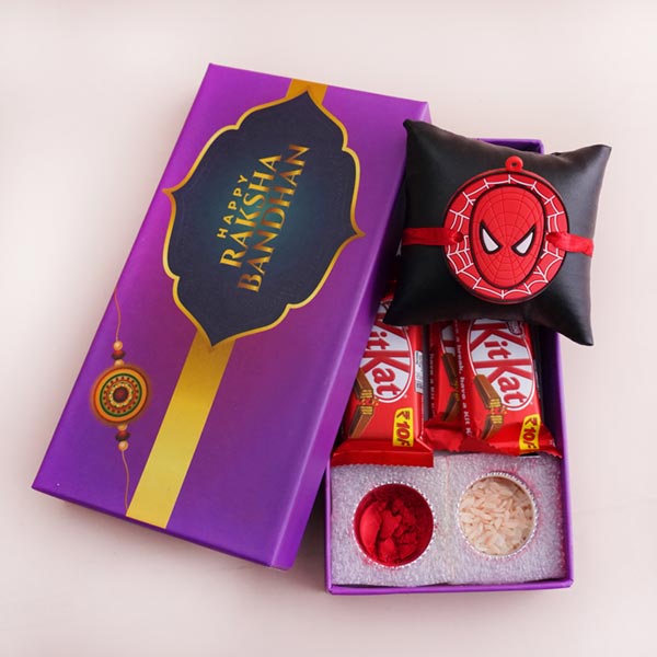 Product Details:The Signature Box Contains: • One Spiderman Kids Rakhi • 4 KitKat Chocolates each of 12.8 gm • Roli and Chawal in containers attached with the designer signature box